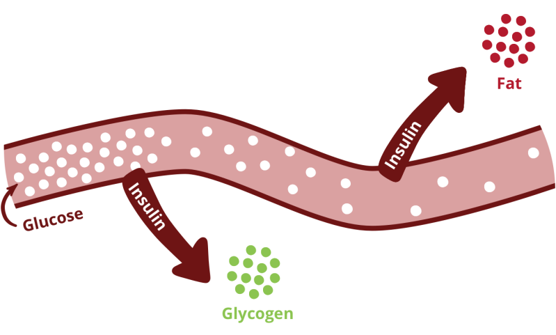 As discussed above, the body has limited capacity to store glucose in the form of glycogen. When there is no more room, insulin will transform the excess glucose into fat.