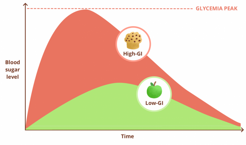 Eating foods with a high glycemic index causes spikes in blood glucose: the amount of sugar in the blood climbs quickly and significantly.The body responds by secreting lots of insulin to bring down the blood sugar level. Then the amount of sugar in the blood takes a nosedive.